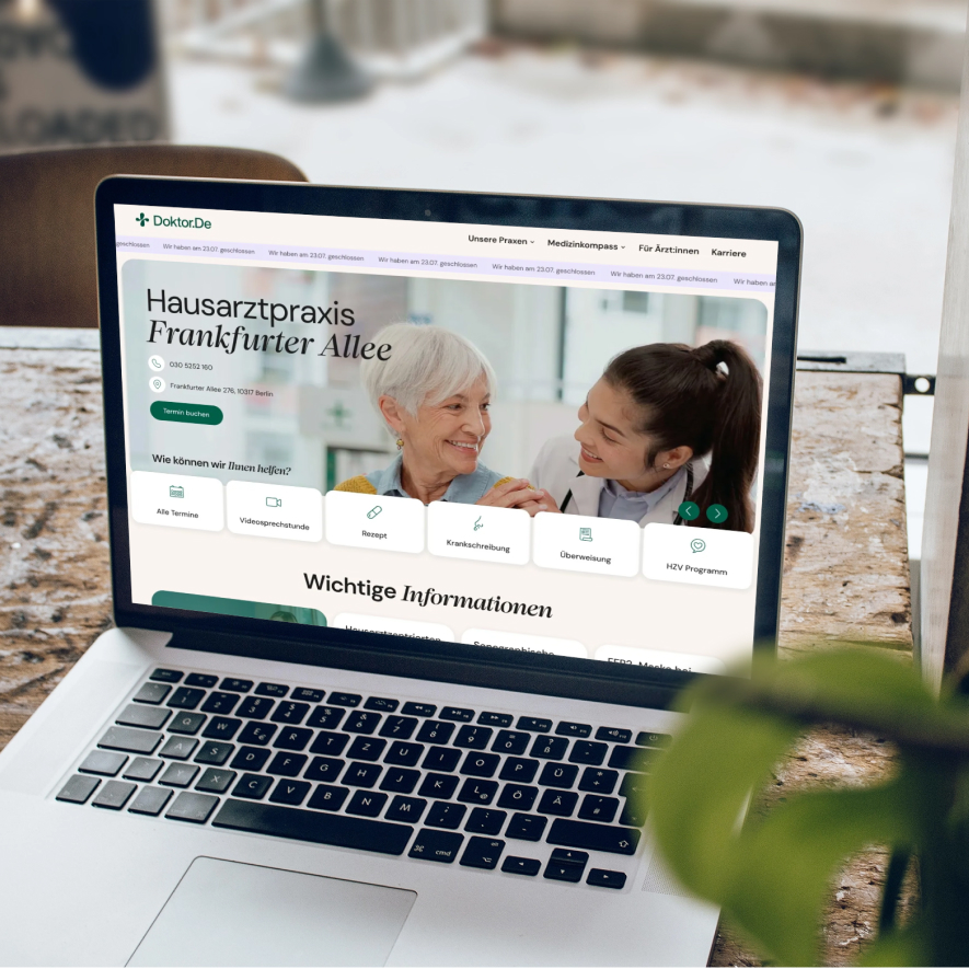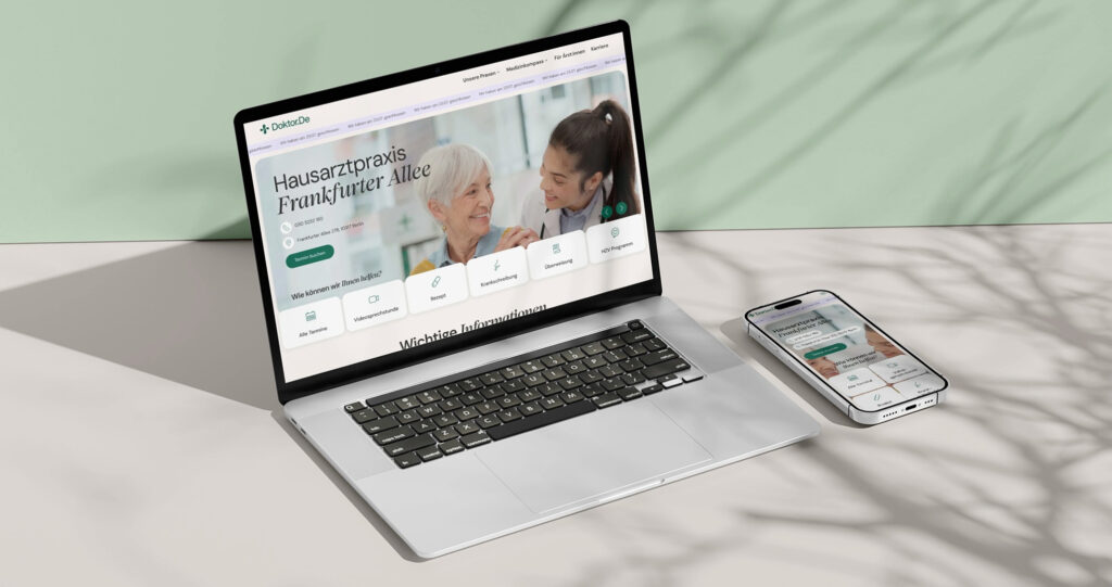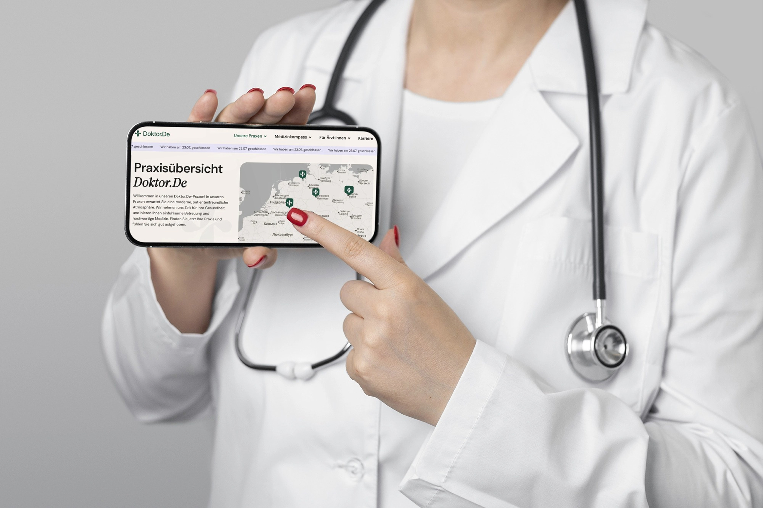 - Designfokus: Schaffung eines professionellen und vertrauenswürdigen Designs, das die Vision von Doktor.De – die persönliche Betreuung vor Ort kombiniert mit digitaler Medizin – klar vermittelt.